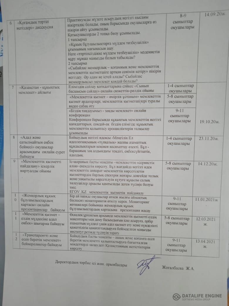 3. Мектеп оқушыларының арасында, оқушыларға адам құқықтары жайлы түсініктерін қалыптастыру; «жемқорлық» деген не екенін түсіндіру;өз ойларын еркін жеткізе білу қабілеттерін дамытуға; дүниетанымдарын кеңейту;патриоттық тәрбиені қалыптастыру мақсатында онлайн сынып сағаттары өтті.