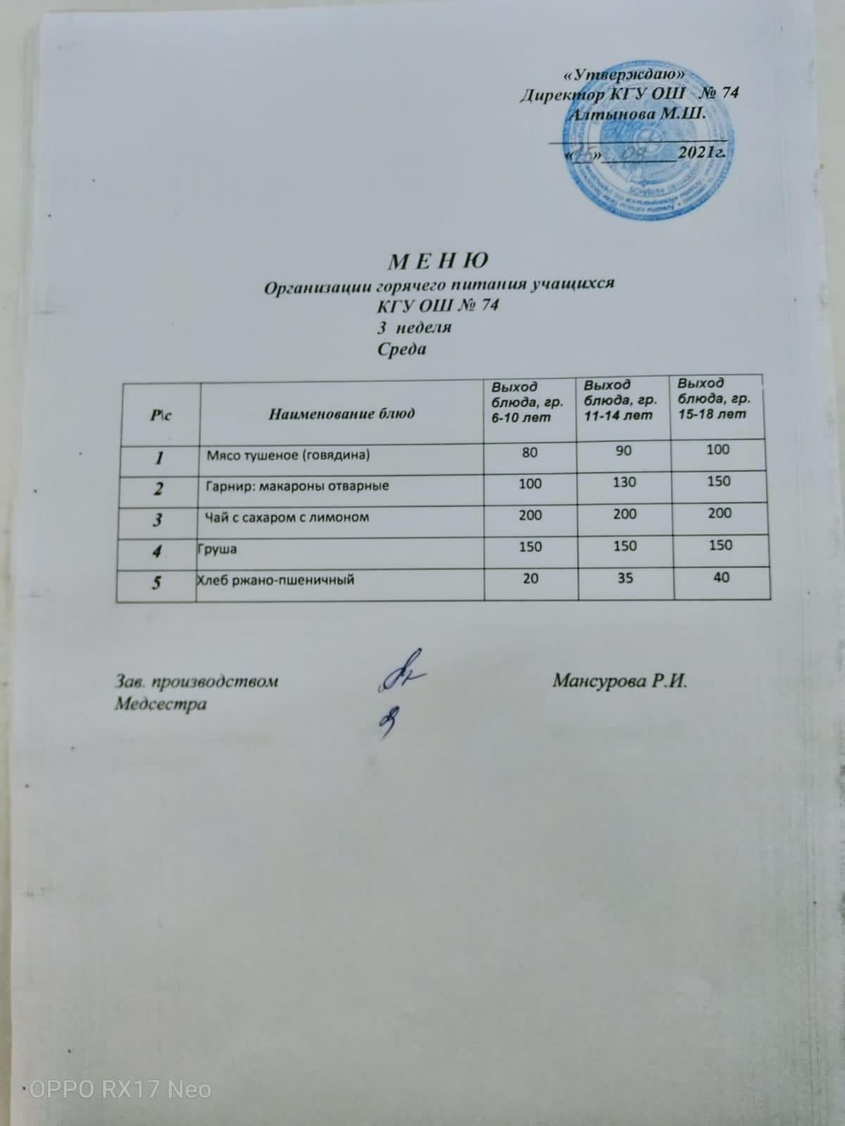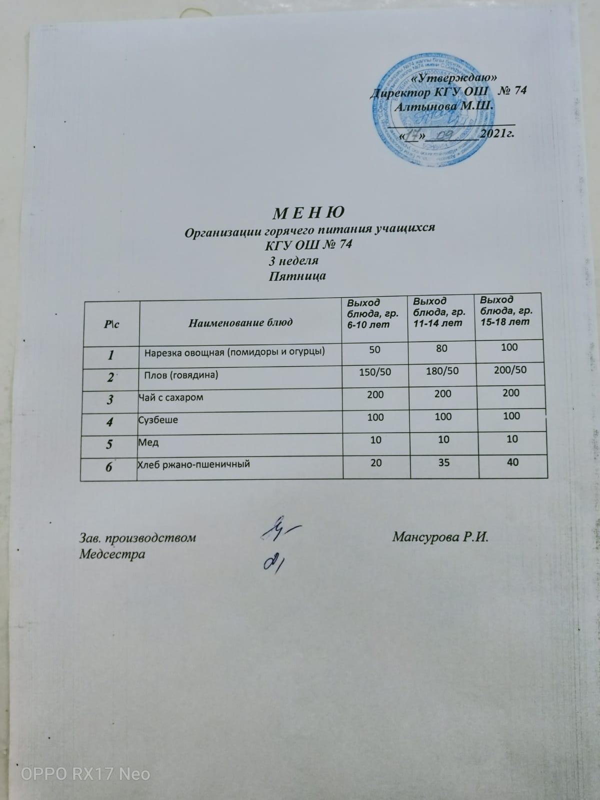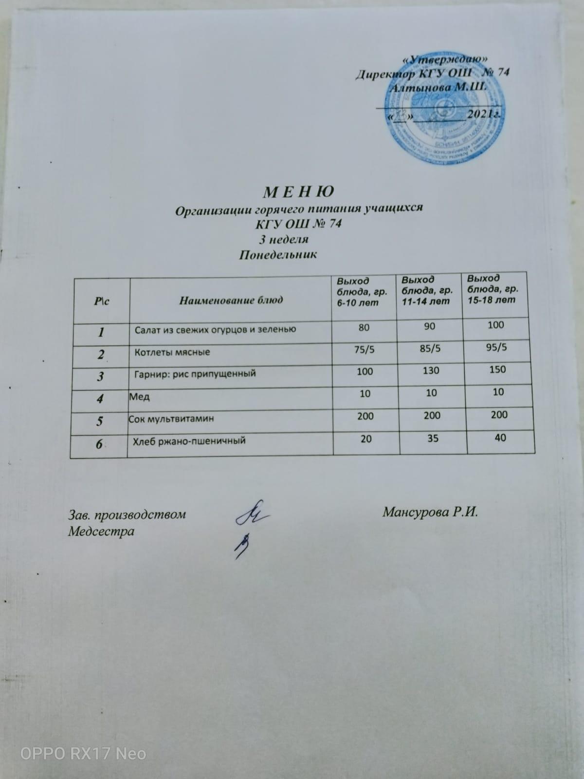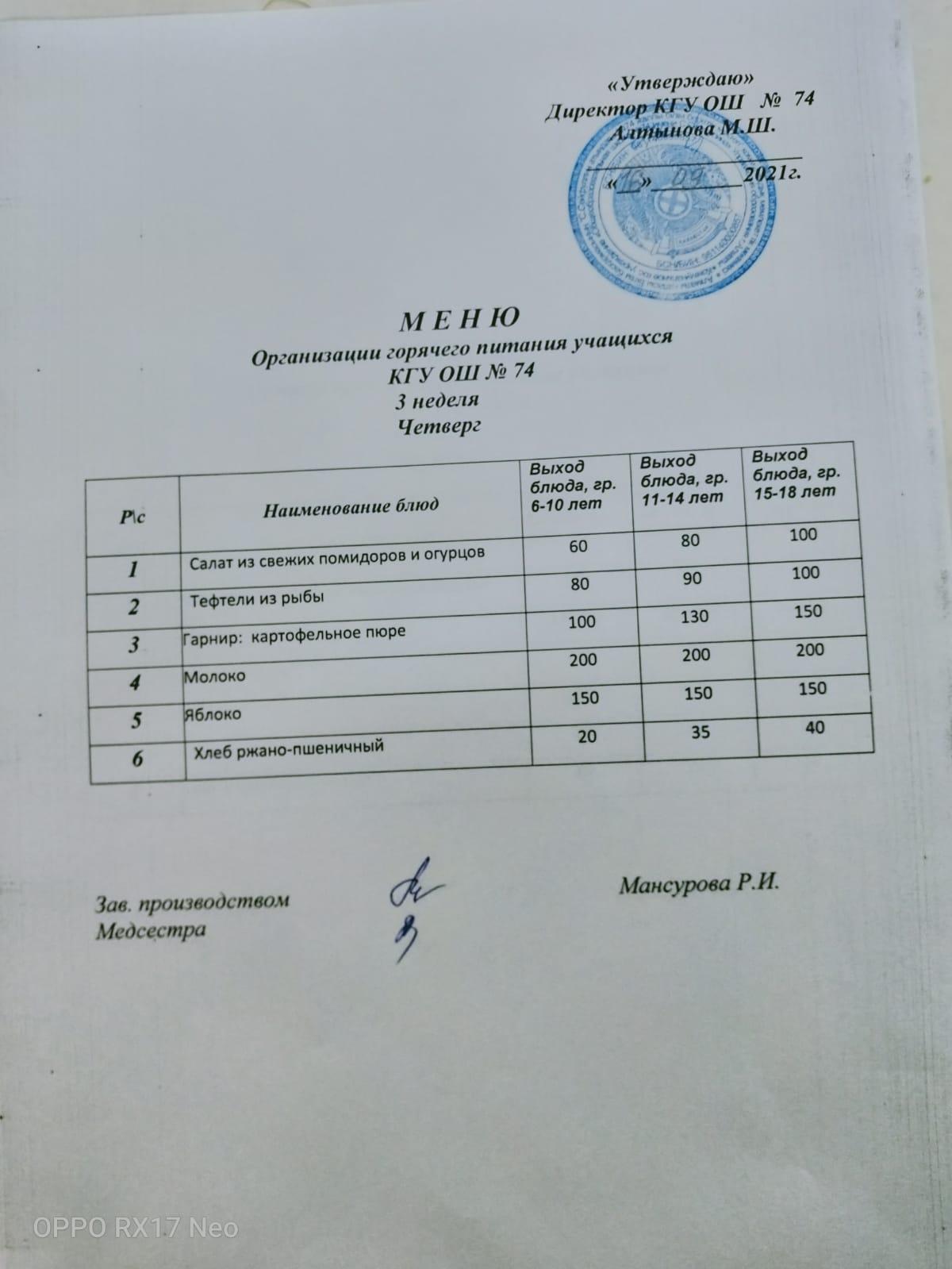 Четырехнедельное меню блюд организации бесплатного питания отдельных категорий обучающихся в организациях среднего образования
