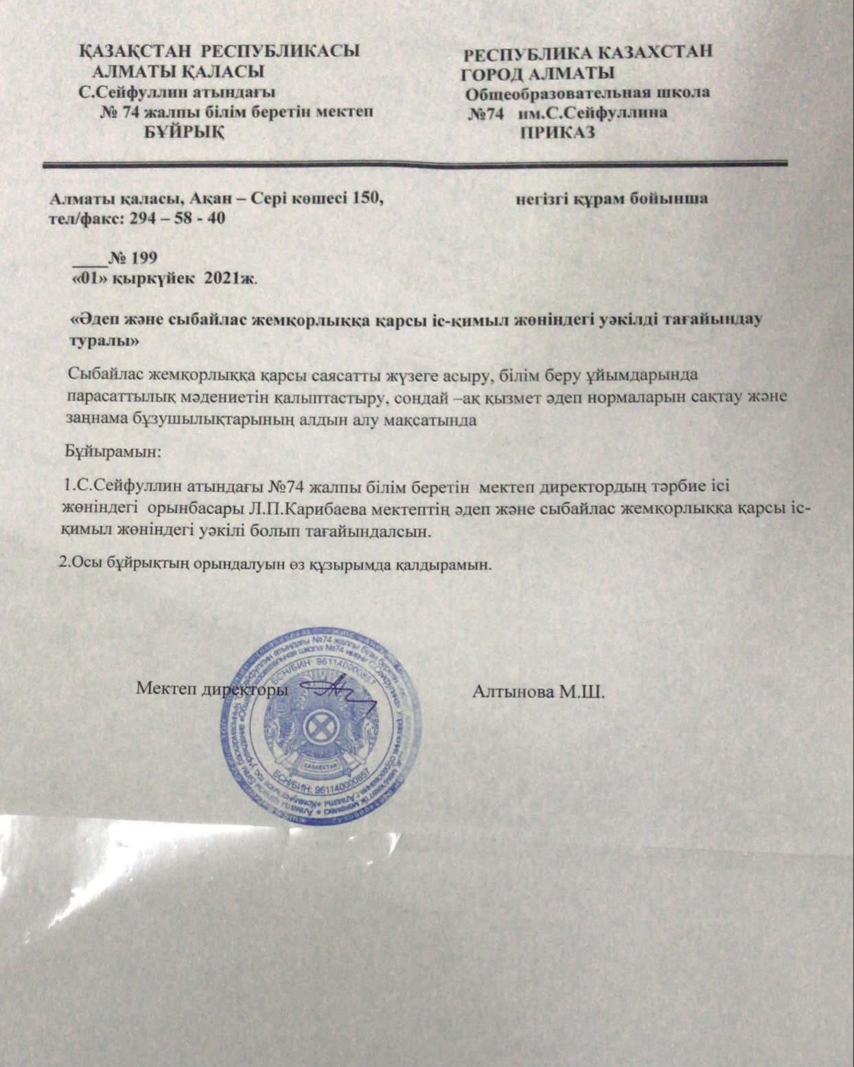 13 қазан 2021 0 1 2 3 4 5 Әдеп пен сыбайлас жемқорлыққа карсы іс-қимыл жөніндегі уәкілді тағайындау туралы Осы беттің QR-коды:QR-код этой страницы: