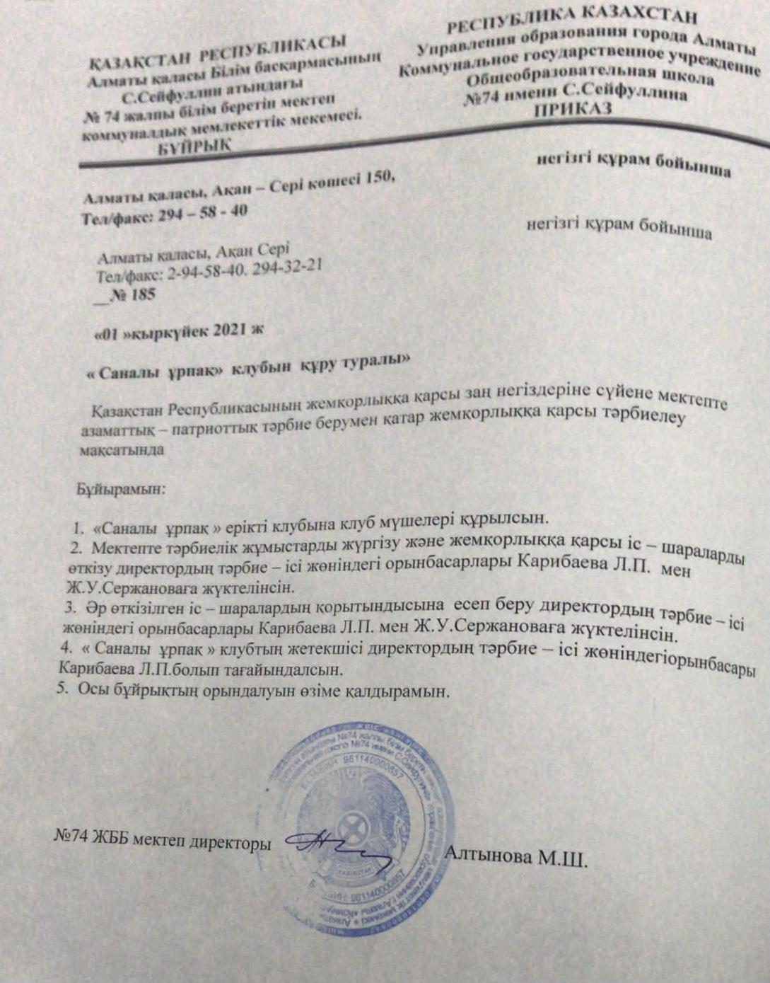 Коммунальное государственное учреждение «Общеобразовательная школа № 74 имени С.Сейфуллина» Управления образования города Алматы