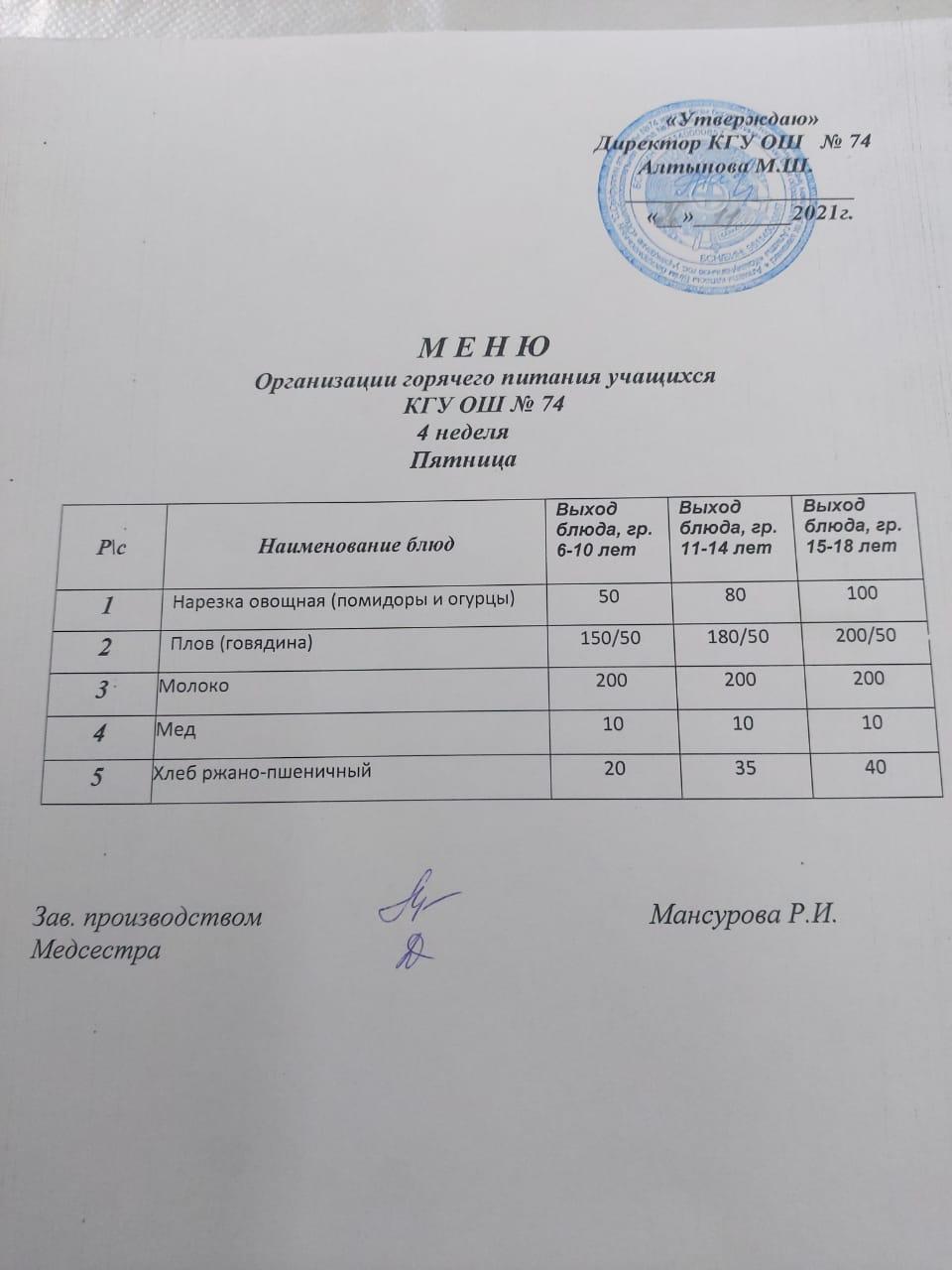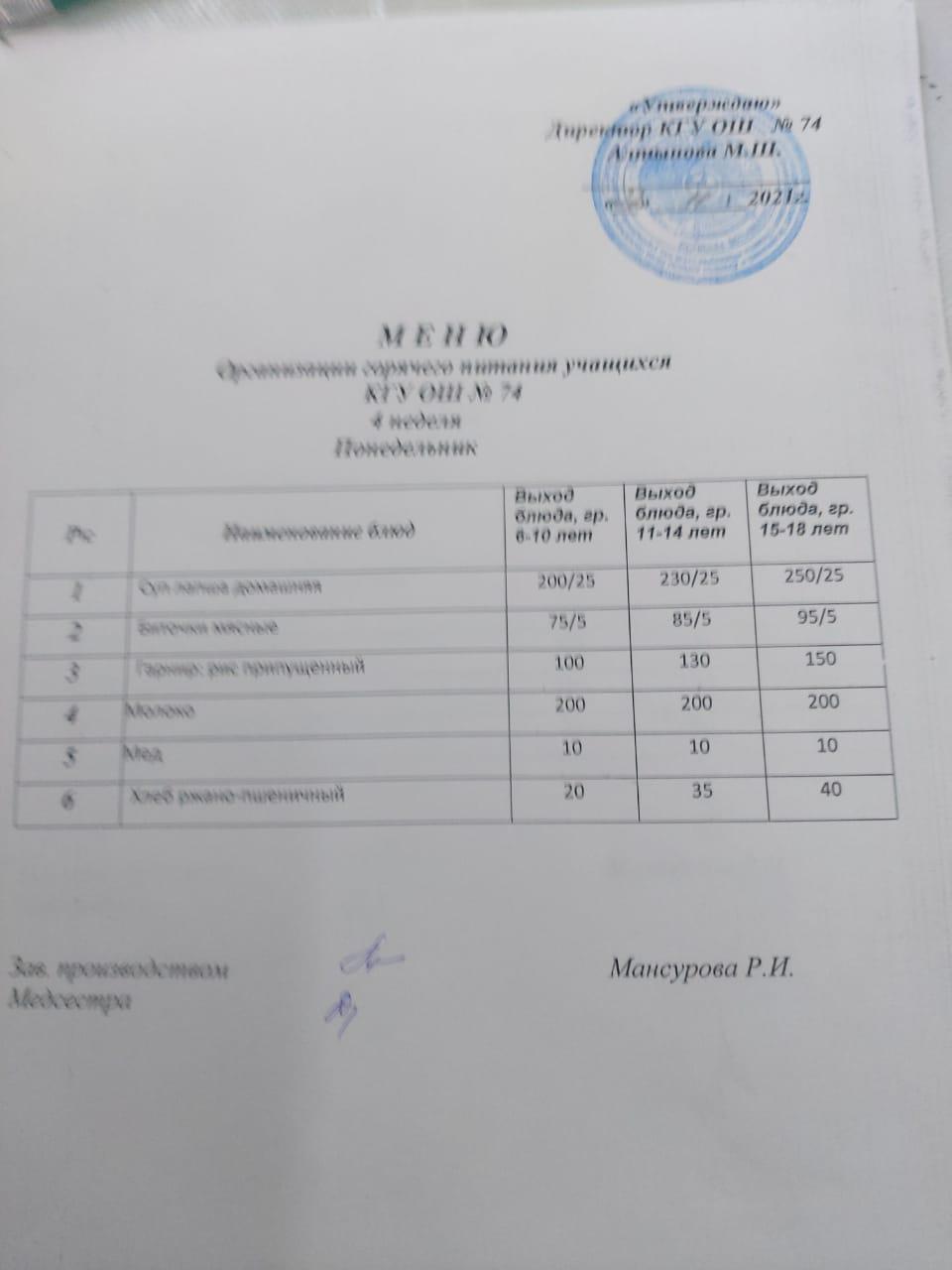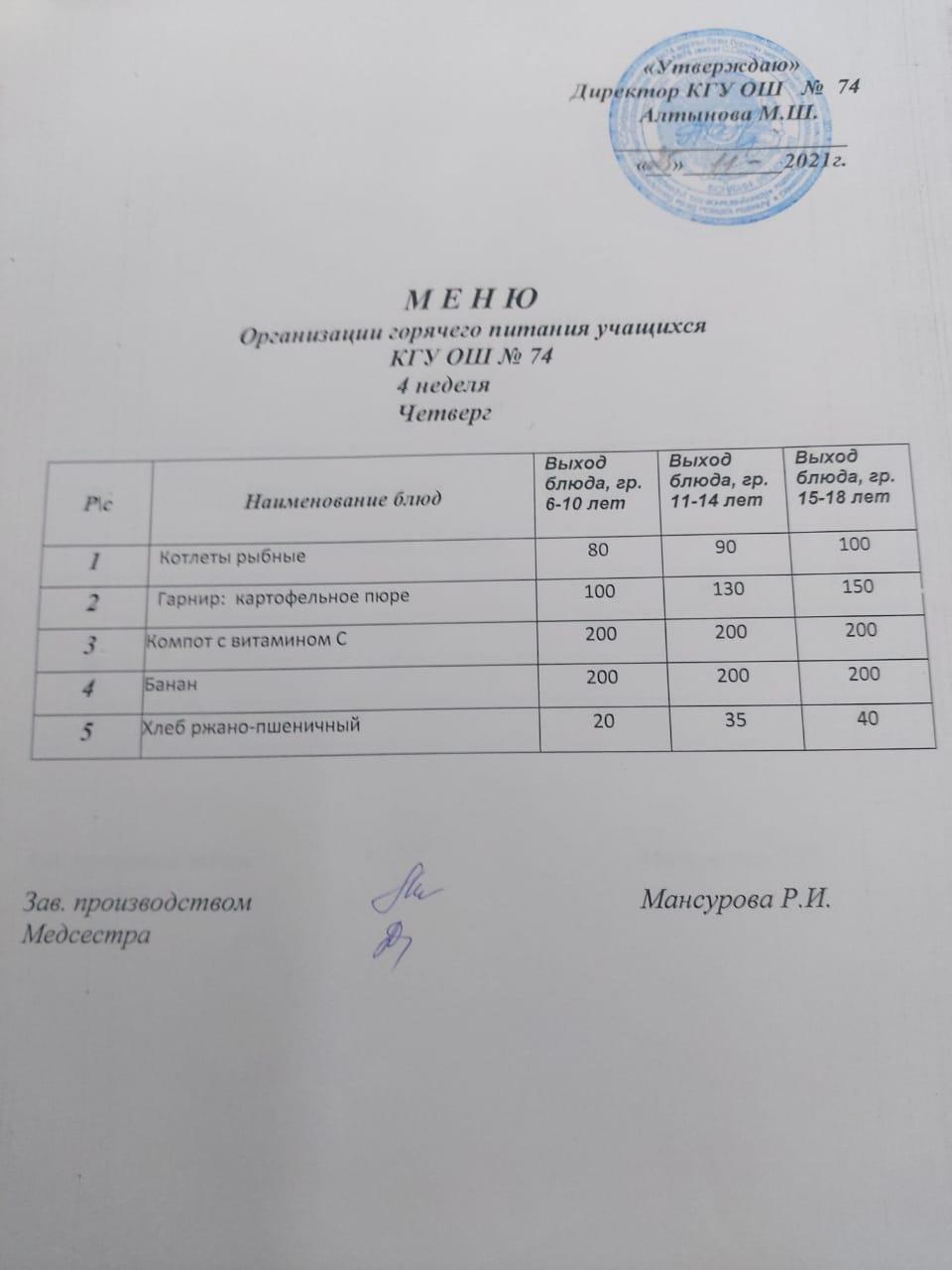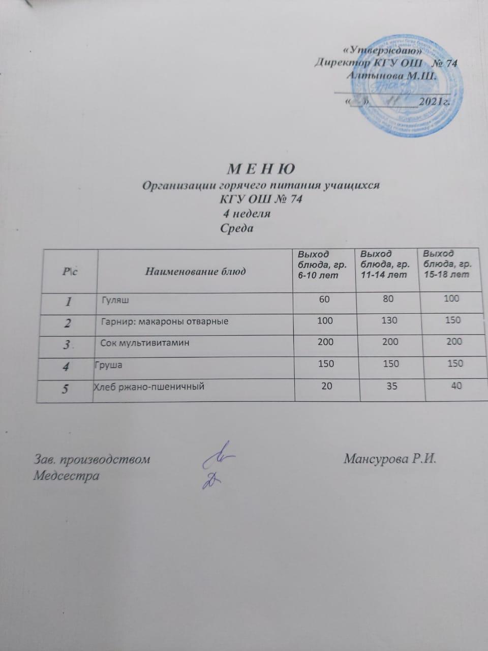 Четырехнедельное меню блюд организации бесплатного питания отдельных категорий обучающихся в организациях среднего образования