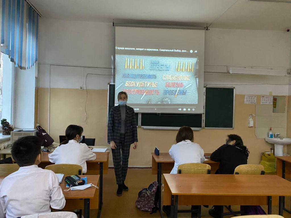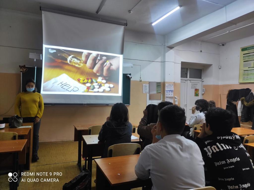 Оқушыларға темекі мен нашақорлықтың зияны туралы түсіндіру мақсатында 8-10 сыныптар аралығында мектебімізде "Темекі шегу, алкоголизм және нашақорлықтың ұрпаққа әсері" тақырыбында сынып сағаттары өткізілді. Басты міндетіміз - балаларды, зиянды әрекеттерден бойларын аулақ ұстауға, зиянды әрекеттерге әуес болмауға тәрбиелеу. Оқушыларға темекі мен нашақорлықтың зияны туралы түсіндіру. Оқушыларды салауатты өмір салтын ұстануға дағдыландыру.