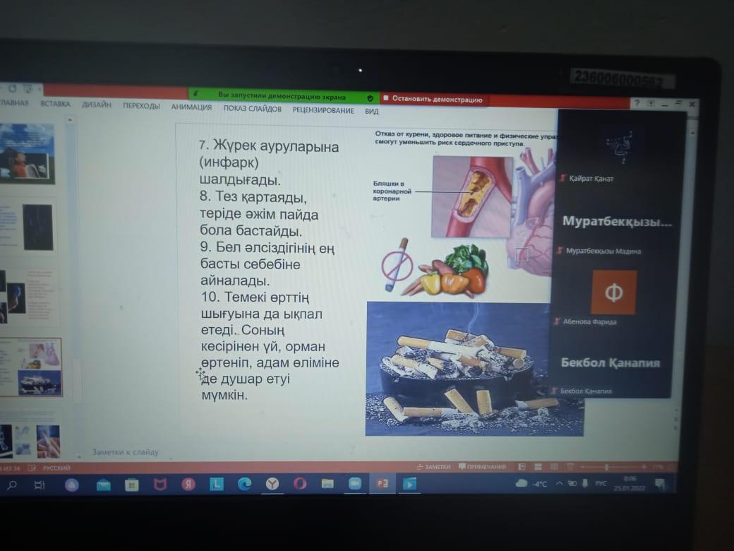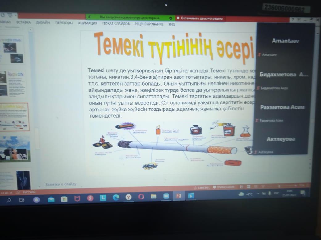 Президентіміз жастарға сенім арттырып отыр, бірақ біздер жастар мұндай жаман әдеттерге үйір болсақ, онда біздің мемлекетіміздің болашағы қандай болмақ? Осы мақсатты негізге ала отырып, мектебімізде 8-11 сыныптар арасында онлайн форматында сыныптан тыс іс-шаралар өткізілді. Мультимедиялық презентациялар көрсетілді.