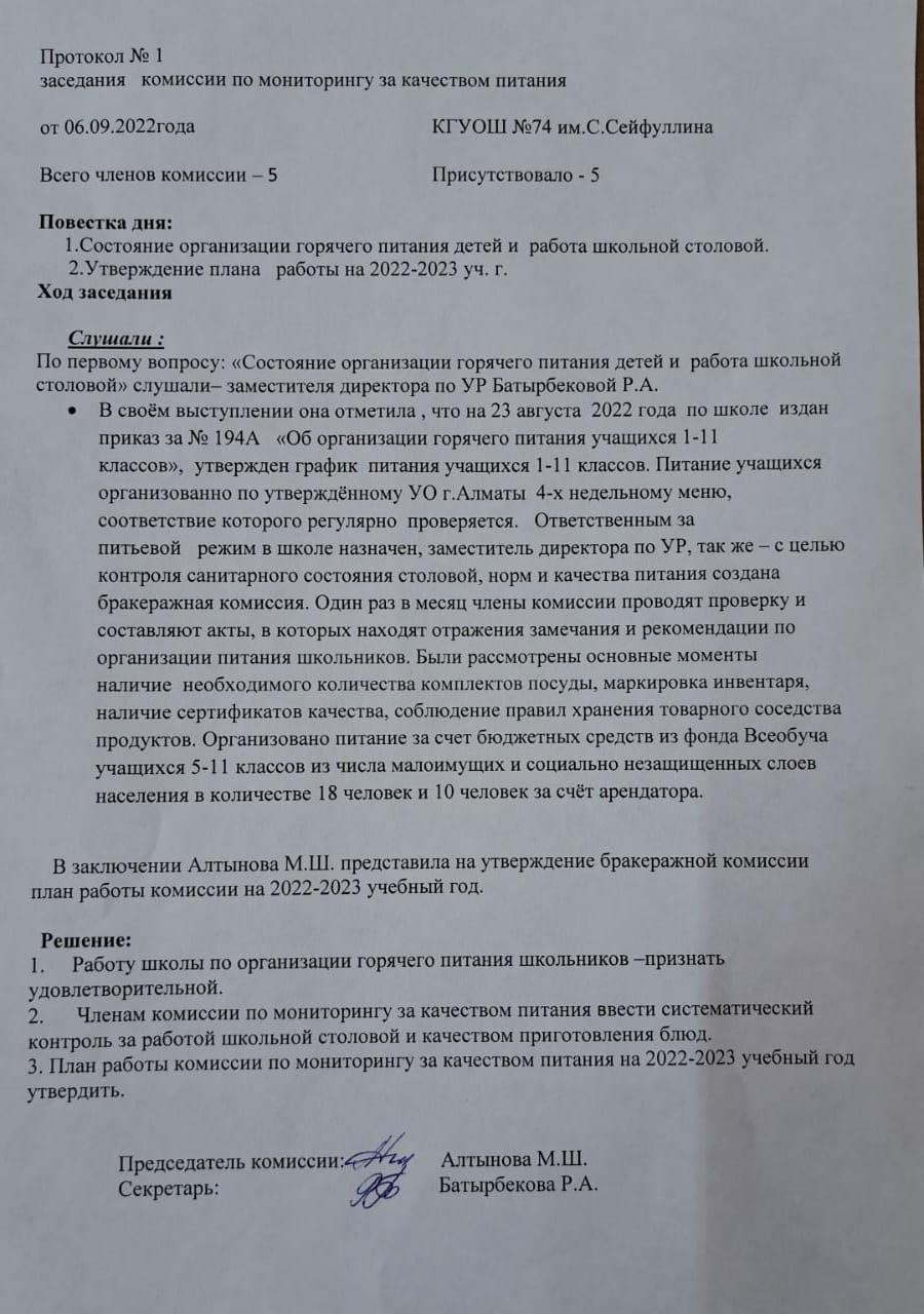 14 қыркүйек 2022 0 1 2 3 4 5 Тамақтану сапасын бақылау жөніндегі комиссия отырысының №1 хаттамасы. Протокол №1 заседания комиссии по контролю качества питания. Осы беттің QR-коды:QR-код этой страницы: