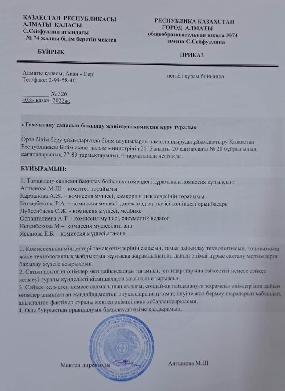 03 қазан 2022 0 1 2 3 4 5 "Тамақтану сапасын бақылау жөніндегі комиссия құру туралы" бұйрық. Приказ «О создании комиссии по контролю за качеством питания». Осы беттің QR-коды:QR-код этой страницы: