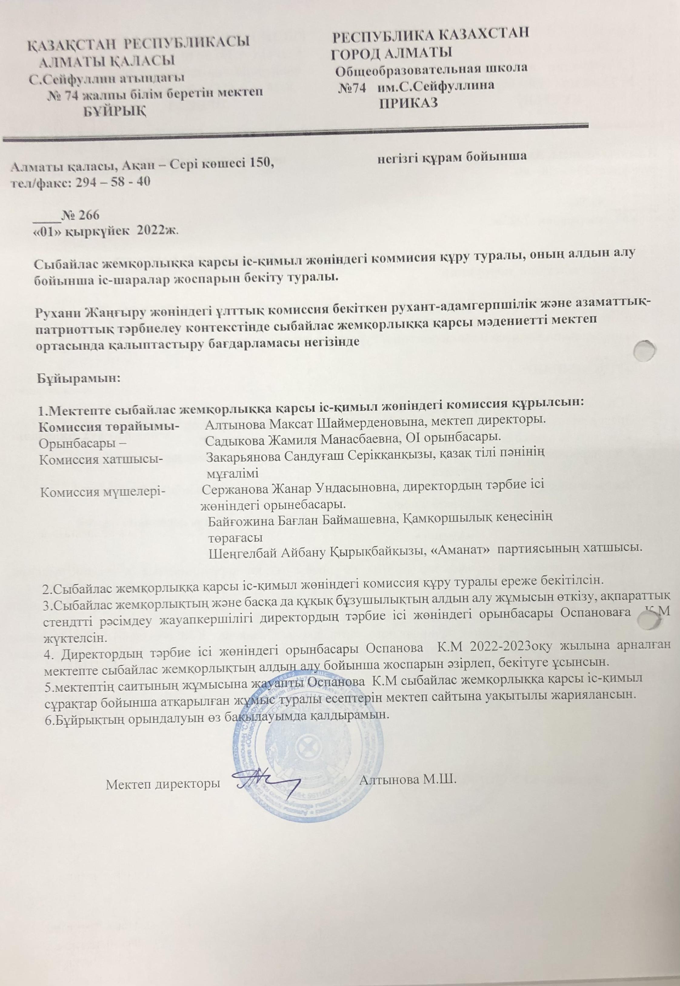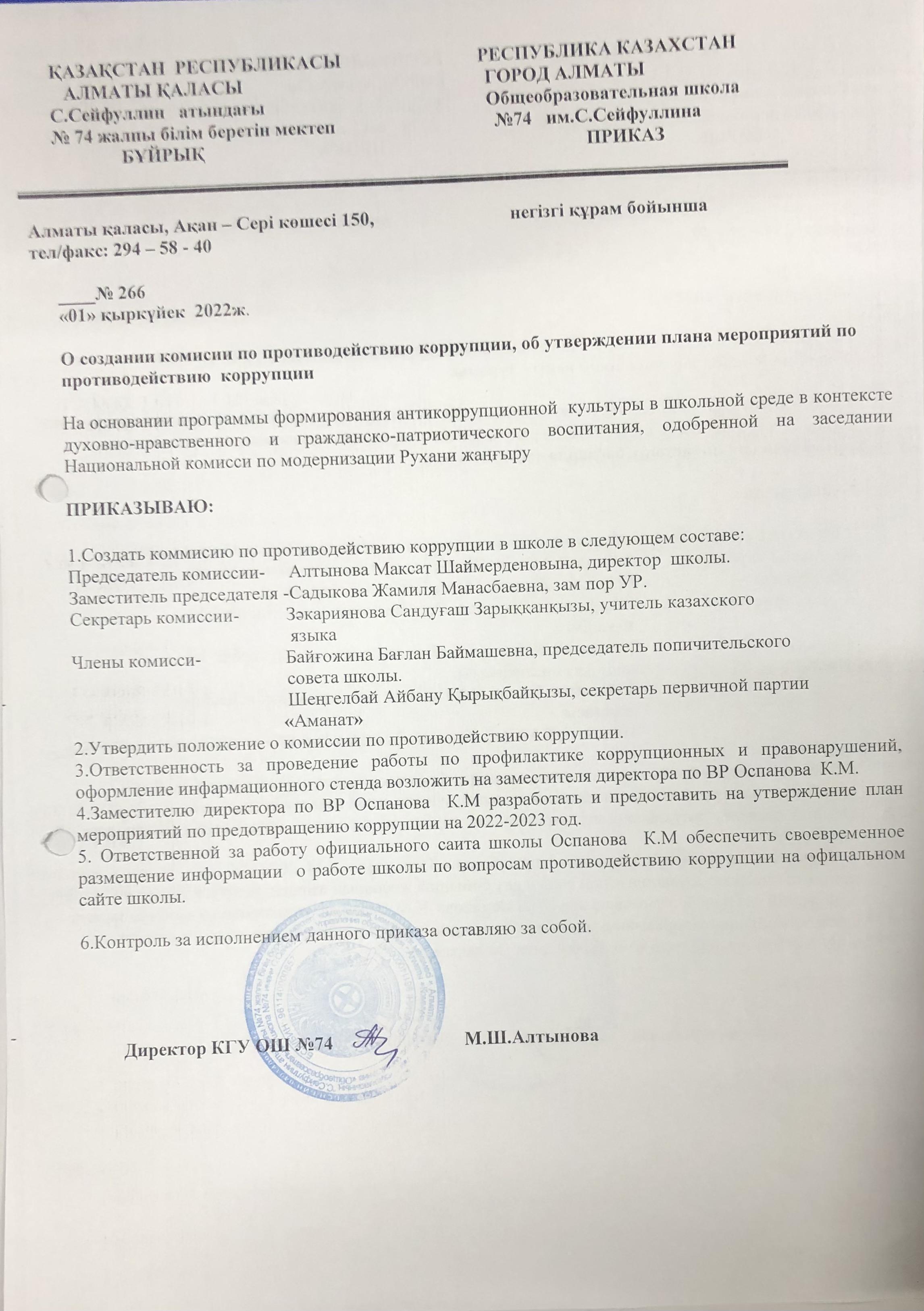 01 қыркүйек 2022 0 1 2 3 4 5 "Сыбайлас жемқорлыққа қарсы іс-қимыл жөніндегі комиссия құру туралы, оның алдын алу бойынша іс-шаралар жоспарын бекіту туралы" бұйрық Осы беттің QR-коды:QR-код этой страницы: