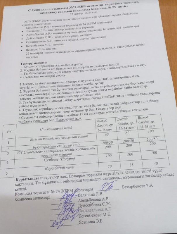 Тамақтану сапасын бақылау жөніндегі комиссиясының есебі 20 Наурыз 2024/ Отчет комиссии по мониторингу качества питания за МАРТ месяц