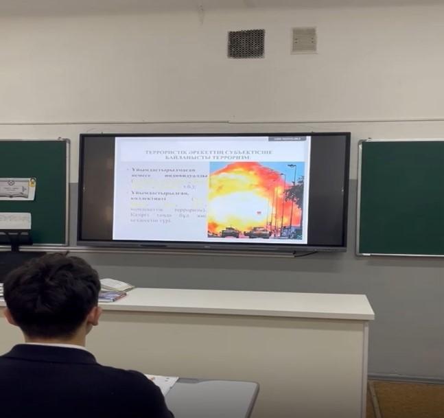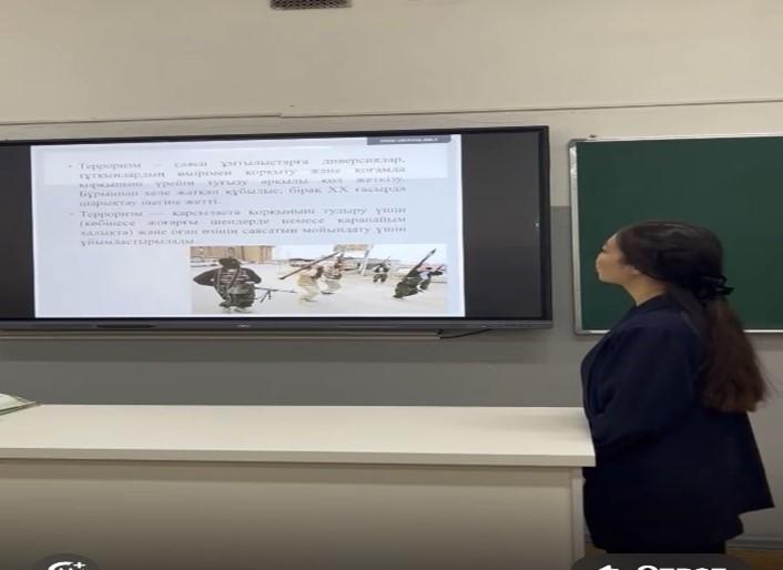 Мақсаты: Оқушыларға терроризм туралы терең түсінік бере отырып, оның түрлерін, себептері мен зардаптарын ұғындырумен қатар білім алушылардың оқиға болған жағдайда қандай алгоритмдерді орындау қажеттілігі туралы айтылды.