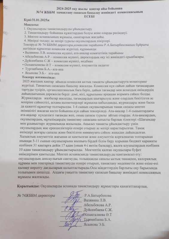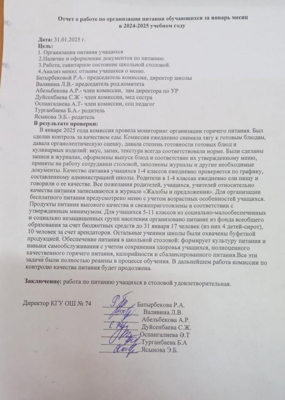 31 қаңтар 2025 0 1 2 3 4 5 Тамақтану сапасы бойынша есеп./ Отчет комиссии по мониторингу качестве питания. Осы беттің QR-коды:QR-код этой страницы: