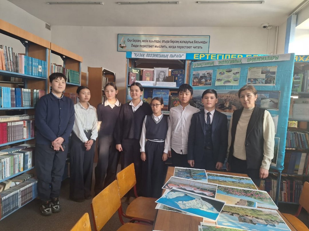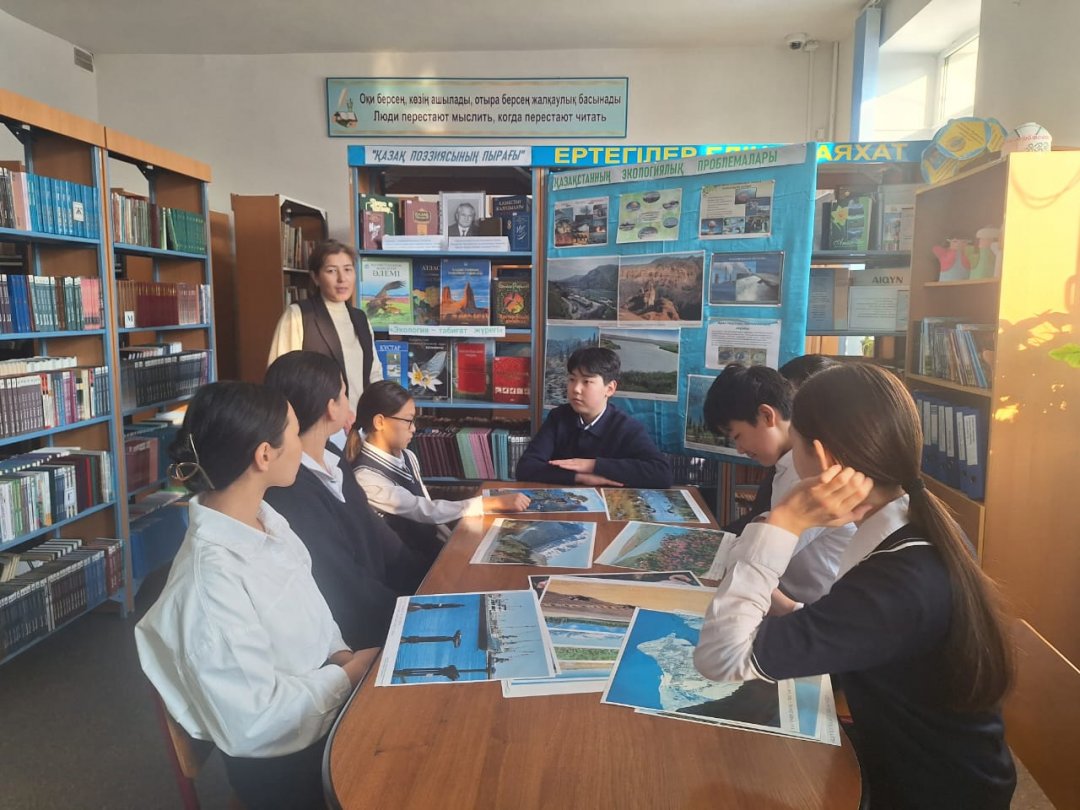 Бүгін мектеп кітапханасында 7 сынып оқушылары мен "Қазақстанның экологиялық проблемалары" атты дөңгелек үстел өткізілді. Дөңгелек үстел соңында қоршаған ортаны қорғау сақтау мәселесі не қатысты қолдаумен жауапкершілікті арттыру үшін барлық қатысушылар өздерінің ұсыныстарын білдіріп, экологиялық іс шараларды қолдау мен жүзеге асыруға белсенді атсалысуға ниет білдірді.