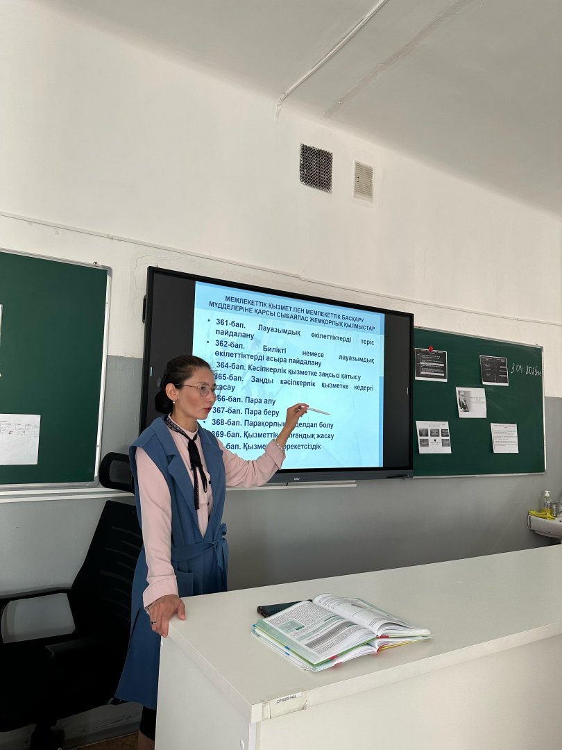 Сабақтың мақсаты — оқушыларды мемлекеттік қызметтің маңызы мен оның қоғамдағы рөлі туралы ақпараттандыру, жастардың болашақта өздерінің патриоттық парызын орындауға деген қызығушылығын арттыру болды. Мұғалім сабақта тарихи оқиғаларды, мысалдарды және нақты өмірлік жағдайларды пайдалана отырып, пәннің мәнін тереңдетті