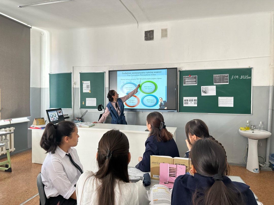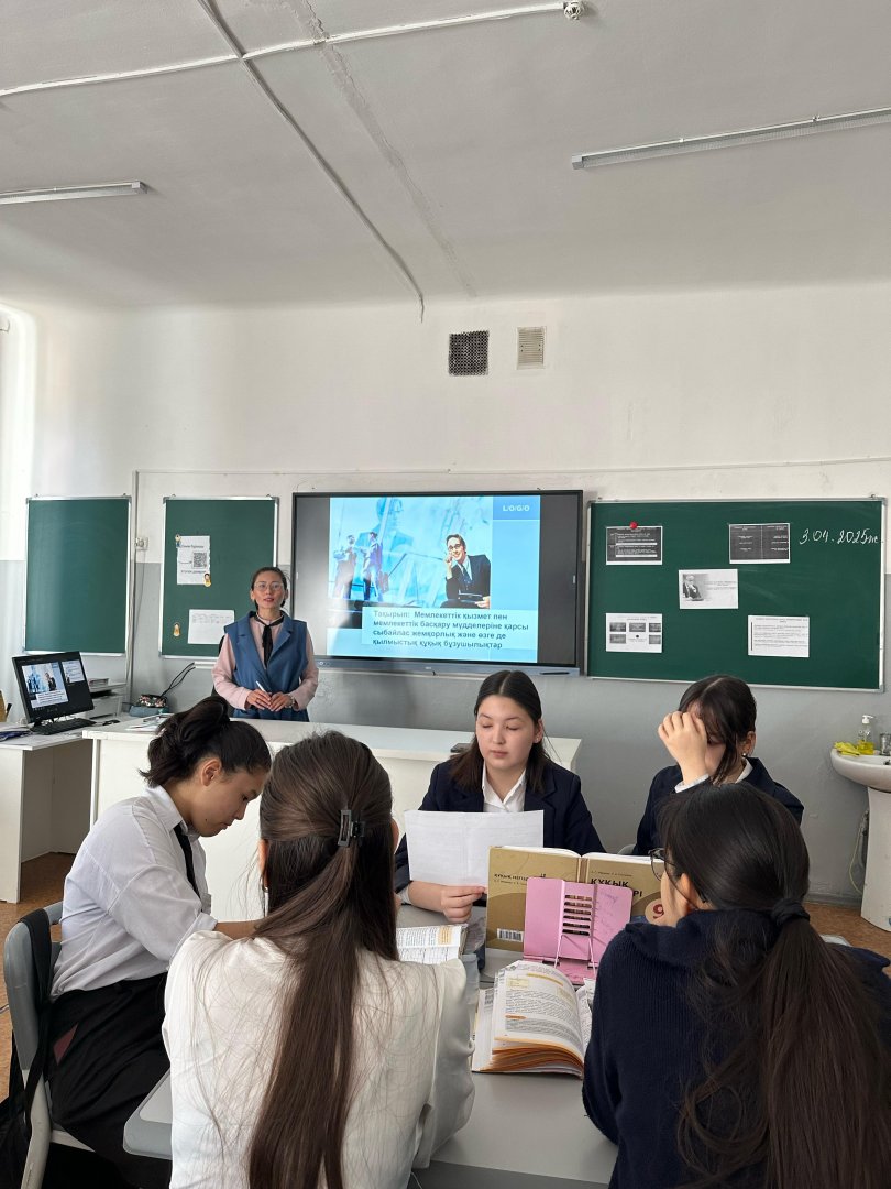03.04.2025 "Мемлекеттік қызмет — өмірлік ұстаным" тақырыбында тарих пәнінің мұғалімі Ашимбаева Ф.Е. дөңгелек үстел өткізді. Сабақ барысында оқушыларға мемлекеттік қызметтің қоғамдық өмірдегі маңызды орны, оның адам өміріне және қоғамға әсері туралы тереңірек түсінік берілді..Сабақта оқушыларға мемлекеттік қызметшінің моральдық және этикалық жауапкершіліктері, оның ел алдындағы міндеттері, адал қызмет ету принциптері түсіндірілді. Оқушылар тақырыпты талқылап, мемлекеттік қызметті атқару үшін қажетті қасиеттер мен дағдылар туралы өз ойларын білдірді.