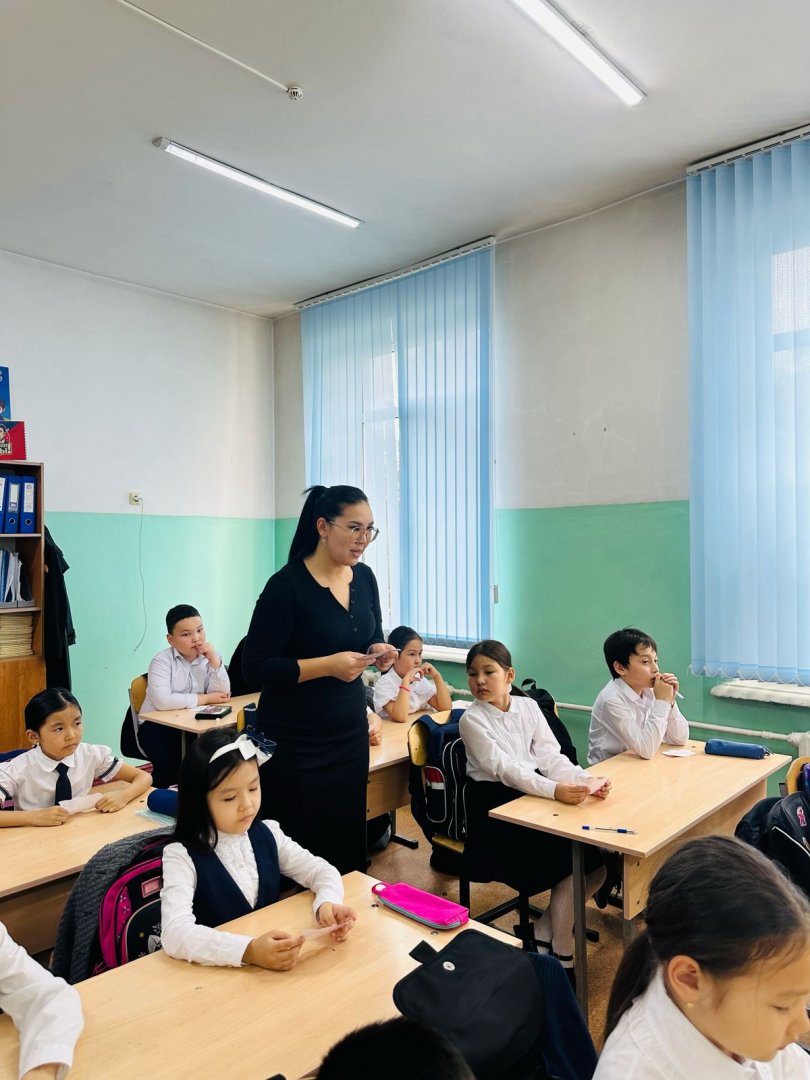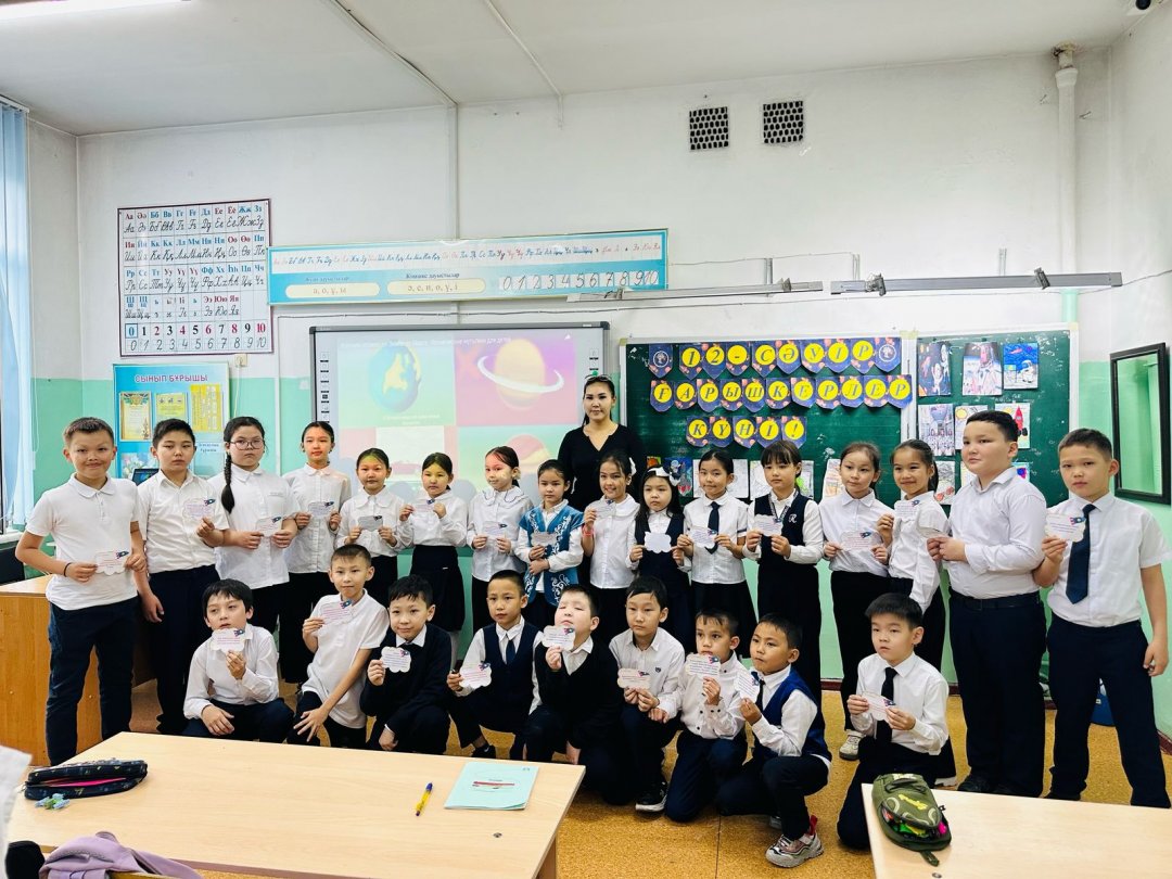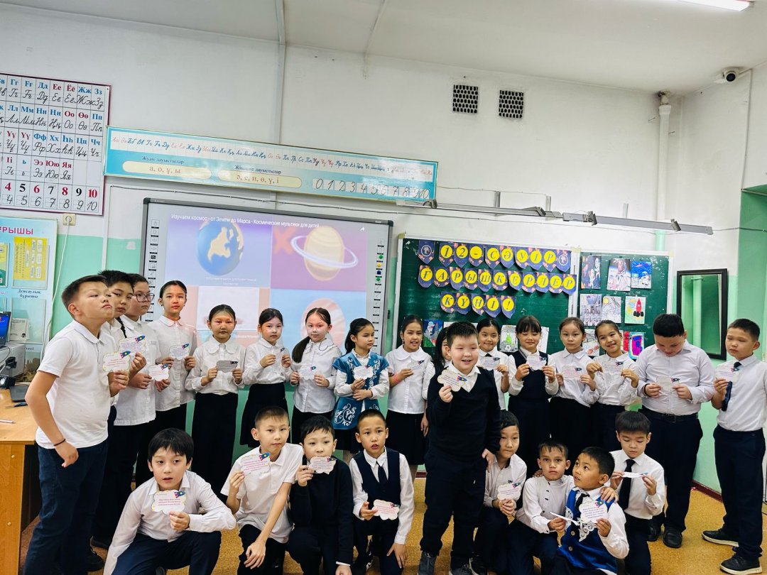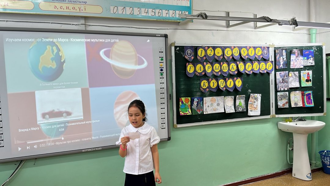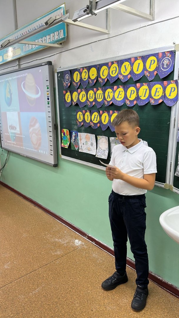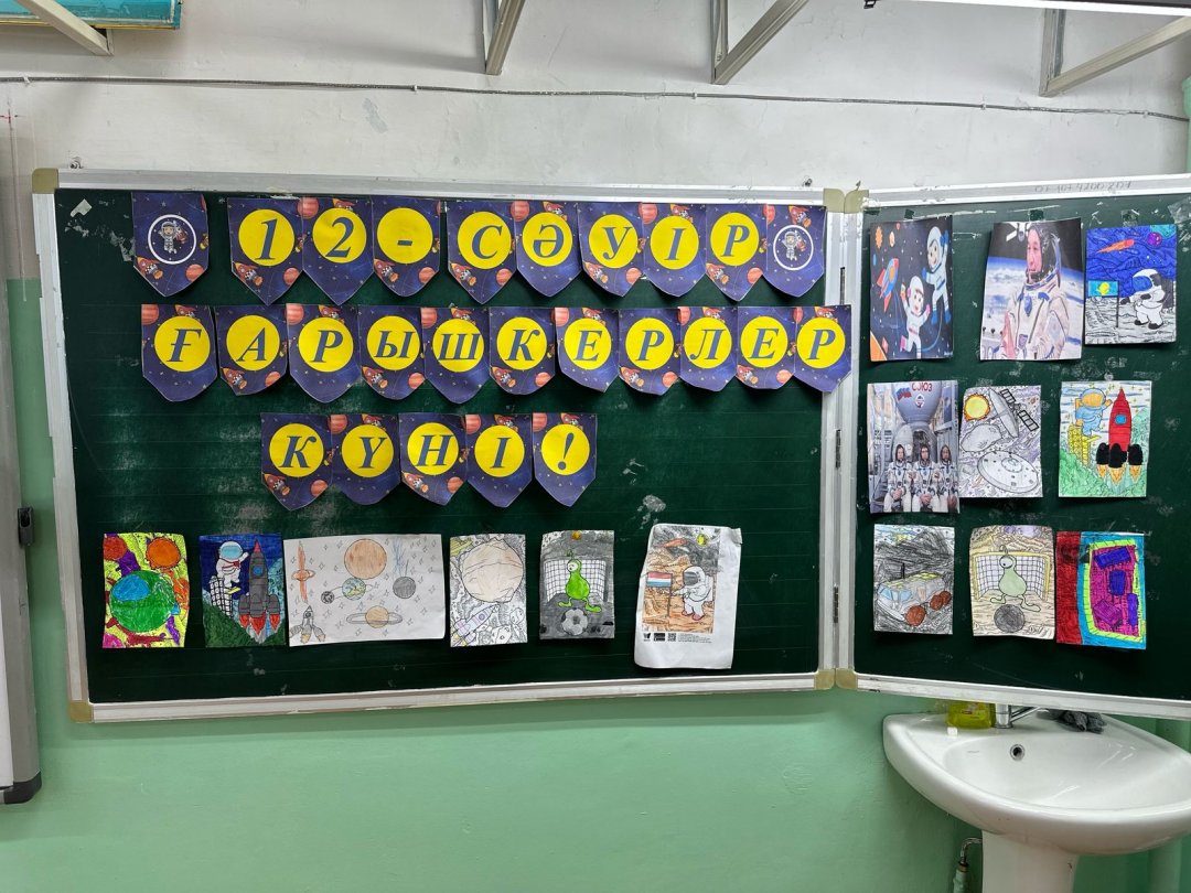 4 "А" сыныбында "12 сәуір- Ғарышкерлер күні" сынып сағаты өткізілді. Жетекші: Шеңгелбай А.Қ. Мақсаты: Оқушыларға ғарыш әлемі туралы түсінік беру, Юрий Гагариннің және басқа да ғарышкерлердің еңбегін дәріптеу, отанға деген сүйіспеншілікті арттыру, ғылым мен техниканың маңызын түсіндіру.