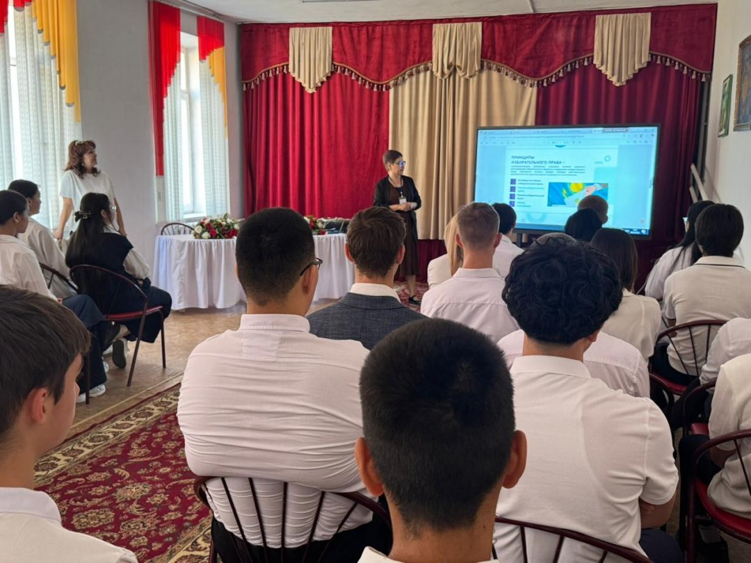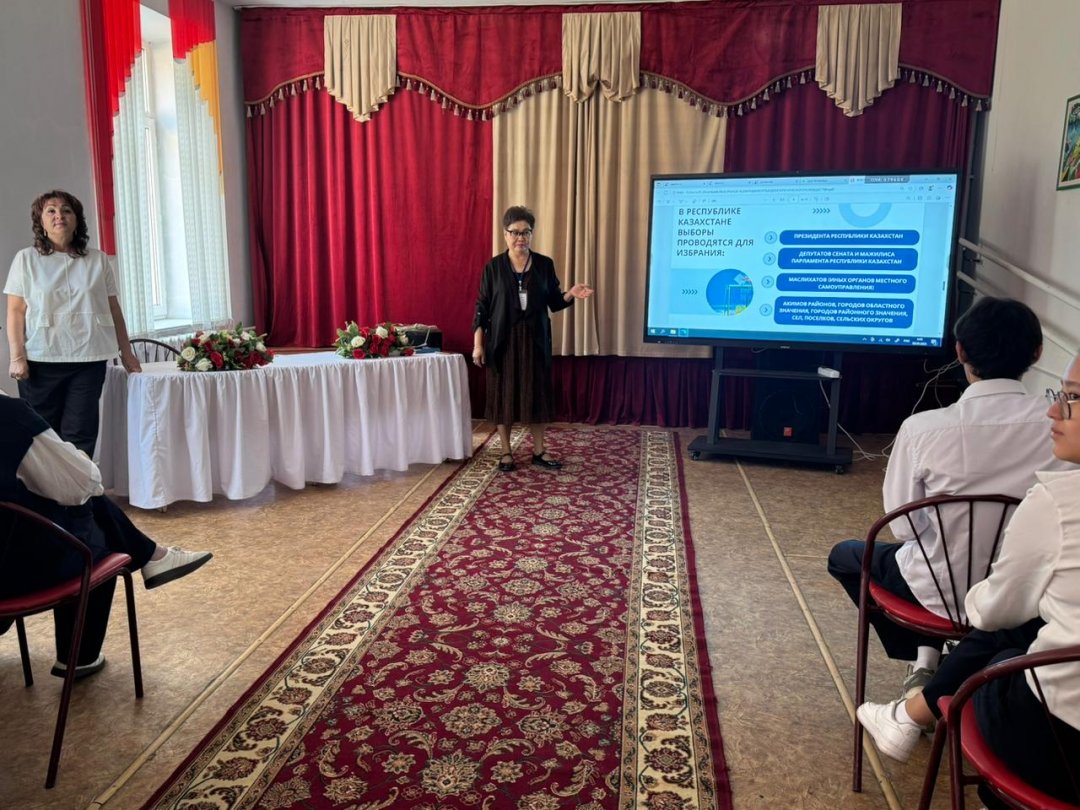 🗳 Аудандық сайлау комиссиясының өкілдері 10–11 сынып оқушыларымен кездесу өткізіп, еліміздегі сайлау жүйесі туралы кең көлемді ақпарат берді.