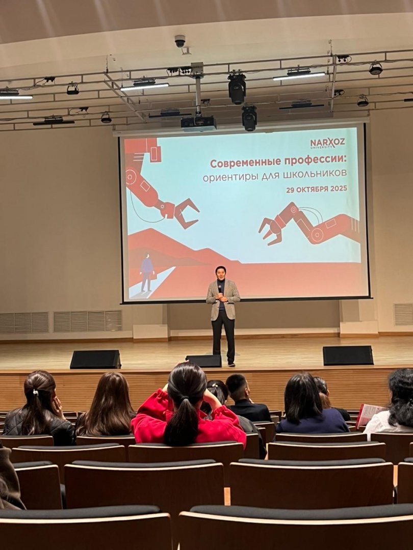 2025 жылдың 29 қазан күні Нархоз университетінде мектеп оқушылары мен талапкерлерге арналған “Заманауи мамандықтар: мектеп оқушыларына бағыт-бағдар” атты ақпараттық-білім беру шарасы өтті. Іс-шараның мақсаты – қазіргі еңбек нарығында сұранысқа ие мамандықтар жайлы жан-жақты ақпарат беру, абитуриенттерге кәсіби бағдар ұсыну, сондай-ақ ҰБТ-ға дайындық бойынша маңызды мәліметтермен таныстыру.