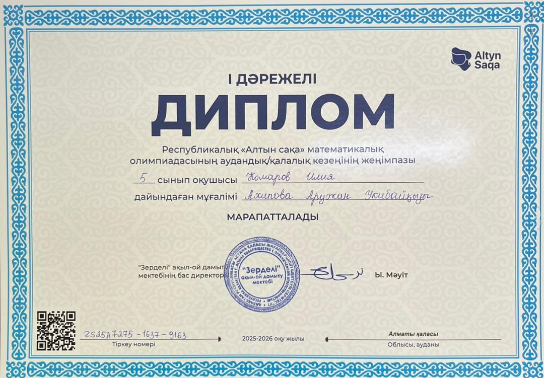 29 желтоқсан 2025 0 1 2 3 4 5 "Алтын сақа" математикалық олимпиадасы Республикалық "Алтын сақа" математикалық олимпиадасының математикалық олимпиадасының аудандық/қалалық кезеңінің жүлдегері Комаров Илия 1 дәрежелі дипломмен марапатталды. Осы беттің QR-коды:QR-код этой страницы: