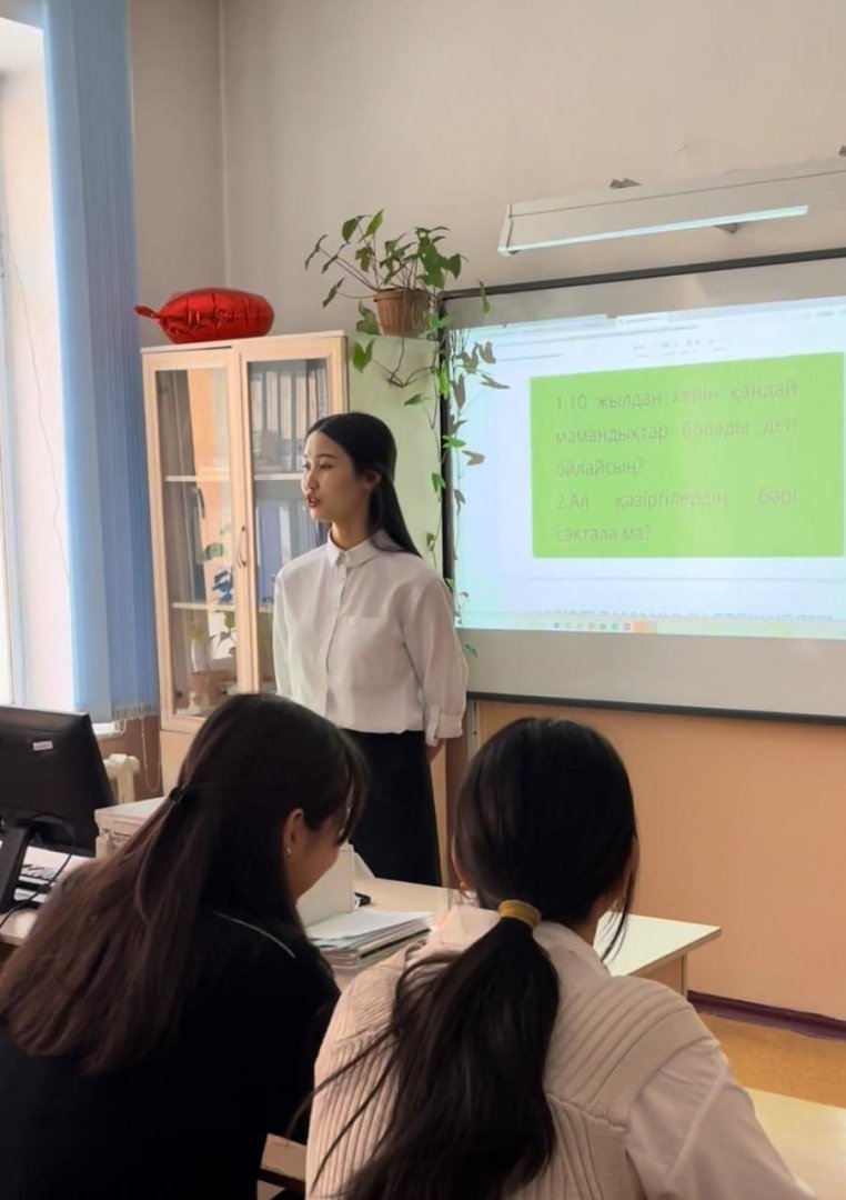 «Қазіргі заман мамандықтары және болашақ» тақырыбындағы сынып сағаты аясында 9 «А» сыныбында кәсіби бағдар беру сабағы өткізілді. Іс-шараның мақсаты – оқушыларға қазіргі еңбек нарығындағы өзгерістер туралы түсінік беру, болашақта сұранысқа ие болатын мамандықтармен таныстыру және саналы түрде кәсіп таңдауына бағыт-бағдар беру.